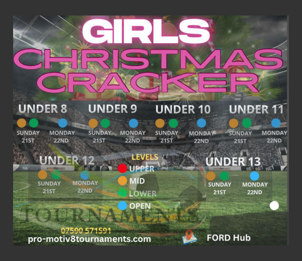 2025/26 - ALL teams MUST be affiliated for new season to enter. Venues vary. Please check which tournament is at which venue. PLEASE SEE WEBSITE FOR NEW 5 LEVEL TIER SYSTEM (Which level tournament you should enter in relation to what league and division are you in). If you're 'playing up' for example - Under 9 Upper must go to Under 10 upper/mid and Under 10 upper/mid should go to Under 11 lower/mid. PLEASE NOTE - this IS NOT SET IN STONE and it’s also the organisers discretion if any team is allowed play up. **Spectator Fees £4 per player applies, paid as a team on the day. This replaced the £2 per adult on the door** NO REFUNDS - Credits given. Within 5 days of tournaments, NO CREDITS given.